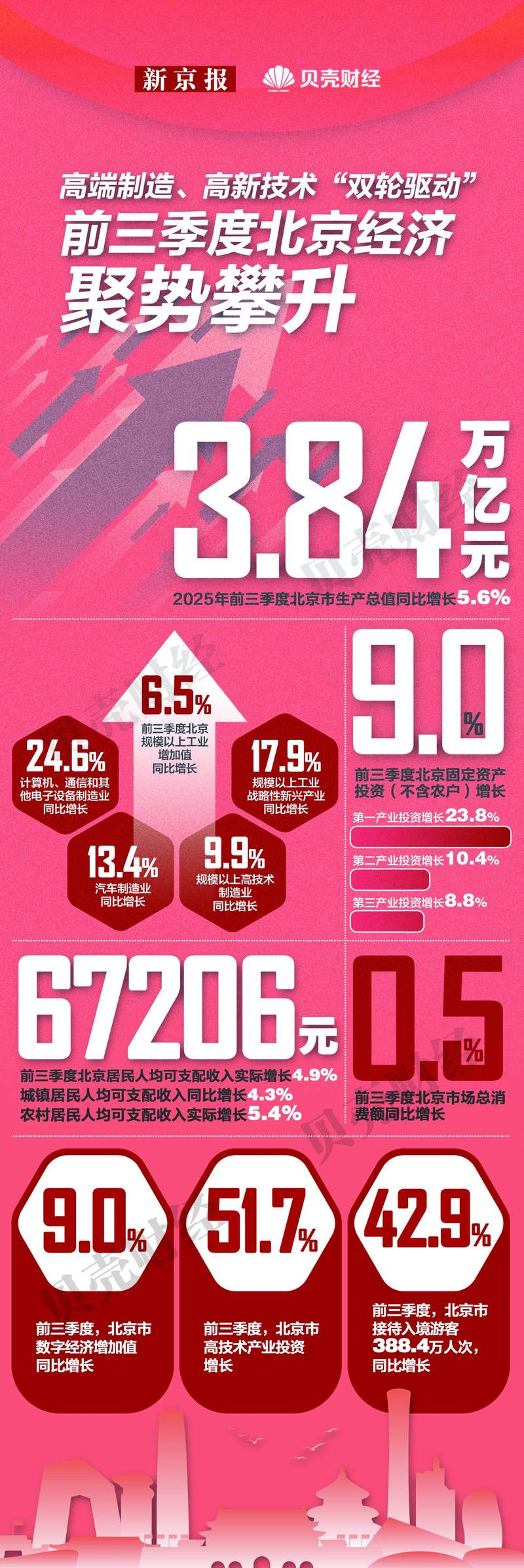 10月22日,北京市统计局发布前三季度北京市经济运行数据。根据地方生产总值统一核算结果,全市地方生产总值384159万元,按可比价格计算,比上年增长5.6%。信息传输、软件和信息技术服务、金融、工业三大优势产业继续发挥主导作用,占全区生产总值的52.5%,对全市经济增长的贡献率超过80%。在此背景下,信息服务业和金融业继续发挥支柱作用,共同推动北京服务业稳定增长。前三季度,全市第三产业增加值按不变价格计算同比增长5.8%,增速比上半年加快0.2个百分点,比一季度加快0.4个百分点。在云计算、大数据服务和新兴软件开发等领域拉动下,信息传输、软件和信息技术服务业增加值增长11.2%,年初以来行业收入增速逐月加快。金融业增加值增长9.0%,比上半年加快0.9个百分点,继续发挥重要支撑作用。今年以来,北京经济发展动力加快转变,新生产力不断壮大。前三季度,全市数字经济增加值同比增长9.0%,其中基础产业增长10.7%。固定资产投资(不含农村)比上年增长9.0%,其中高技术产业投资增长51.7%。同时,高端制造业的设计增速加快,北京工业生产继续保持良好增长势头。前三季度,全市规模以上工业增加值按可比价格计算同比增长6.5%。其中,计算机、通信等电子设备制造业、汽车制造业分别增长24.6%和13.4%。规锂离子电池、新能源汽车等高新技术产品产量成倍增长。消费端,文化、商业、旅游等各类业态城市服务消费同比增长4.8%。年内,北京举办的大型活动和招待会数量均实现两位数增长。人均教育文化娱乐支出增长10.3%。入境旅游方面,前三季度,全市接待游客38.84亿人次,同比增长42.9%。协调人:任娇 记者:杜晓彤 设计:任万庆 校对:卢茜