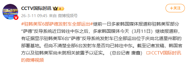 作者:admin2026年3月13日2026年3月13日对“驻韩美军全部六枚“萨德”火箭弹被拆除 – 新京报”作出评论 据@央视国际新闻报道,前日多家韩国媒体报道称,韩国驻韩美军部分萨德反导拦截系统近期被转移至中东,而今日(3月11日),多家韩国媒体继续报道称,有证据表明驻韩美军萨德反导拦截系统的6枚火箭弹已从驻韩基地撤走。庆尚北道星州市。不过,目前还不清楚这六枚火箭是否被转移到中东。截至撰写本文时,韩国官员和驻韩美军尚未证实任何相关披露。 (总台记者:唐鑫)编辑:辛静